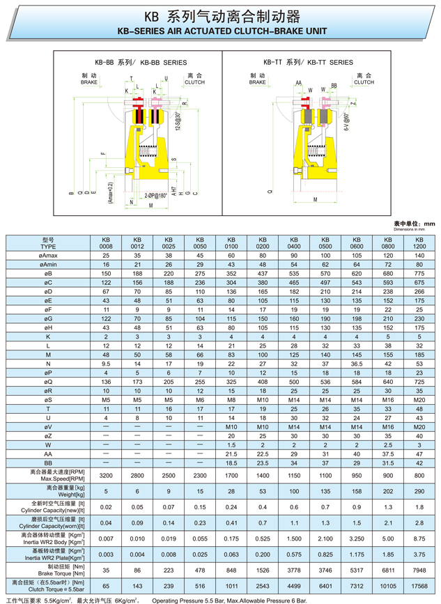 薄型氣動聚散器KB系列產物反映快,合用于毗連及制動。不裝配也可互換磨擦片,合用內徑規模20~220mm ,當氛圍壓0~4mpa時轉距規模為100~400000N.M